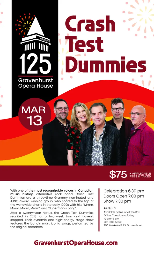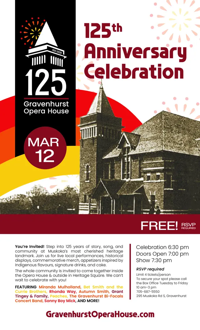 Bring your friends, bring your family, bring your love of community and culture. Let’s make this 125th Anniversary one for the history books—right here in the place where Muskoka’s performing arts legacy continues to live and breathe.